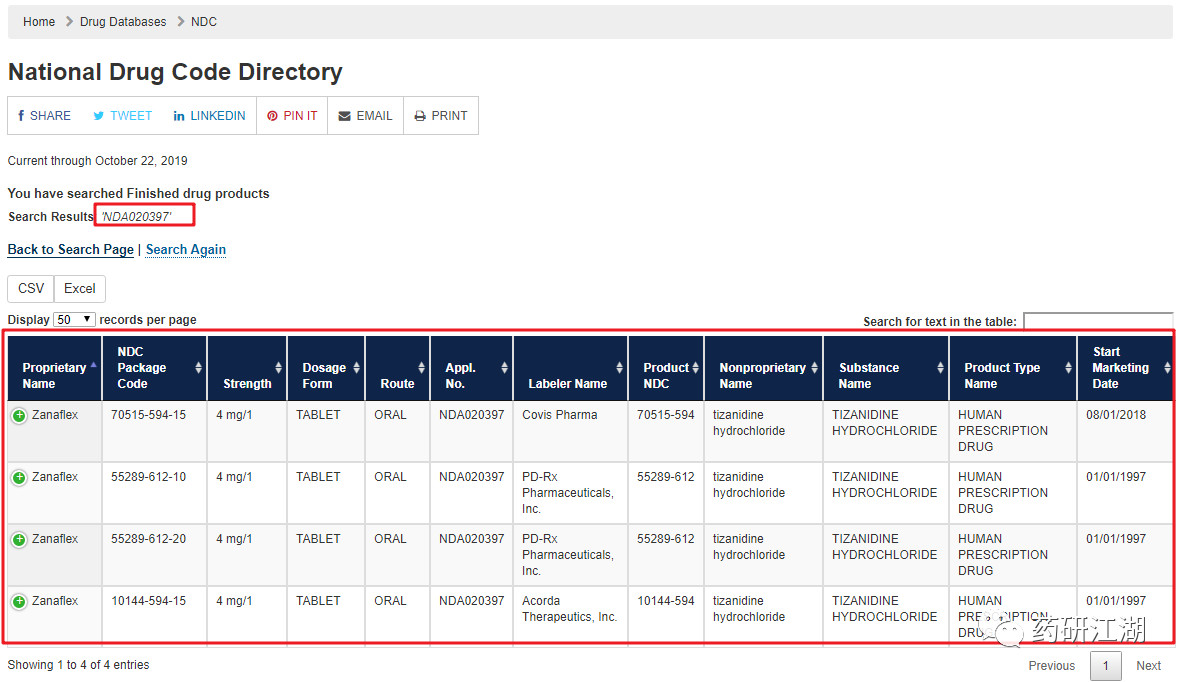 如上所述,FDA 对企业所递交药品清单中的NDC 及相关信息进行整理和筛选,形成NDC 目录。以"NDA020397"为关键词在NDC 目录中检索,可知目前市场上在售的该参比制剂主要有4 种,见下图。